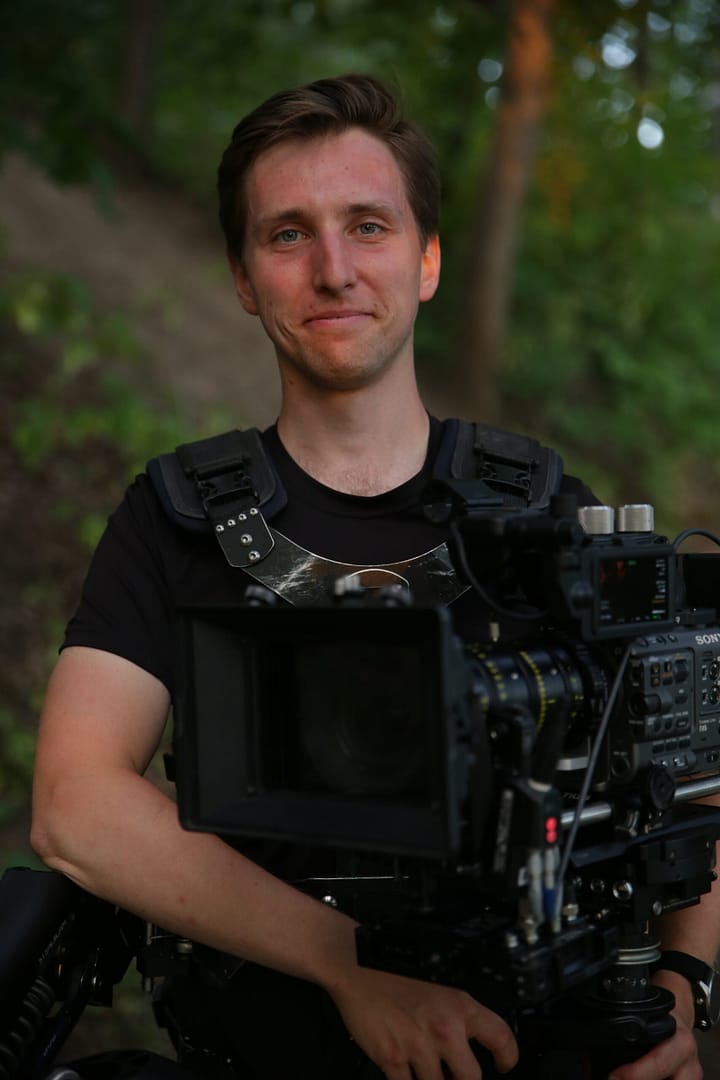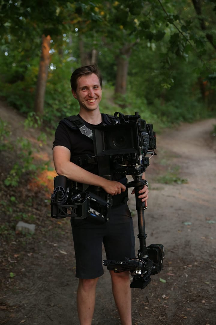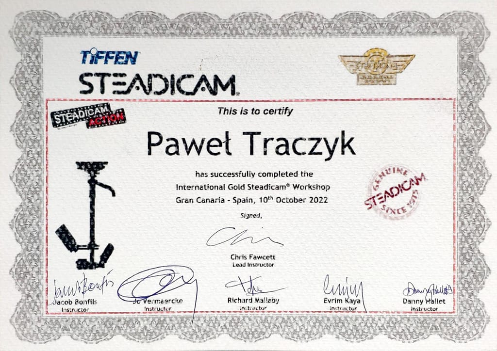 Jestem operatorem steadicamu – od kiedy pierwszy raz założyłem na siebie to fantastyczne dwadzieścia kilogramów metalu i zobaczyłem możliwości ruchu kamery jakie daje, do każdego nowego ujęcia podchodzę z tą samą ekscytacją, co na początku. Rozpoczętą na własną rękę steadicamową podróż przypieczętowałem w 2022 roku, uzyskując certyfikat Tiffen Steadicam Gold po ukończeniu kursu Steadicam Action! w Las Palmas. Teraz już nie ma odwrotu, jest tylko stabilny obraz.